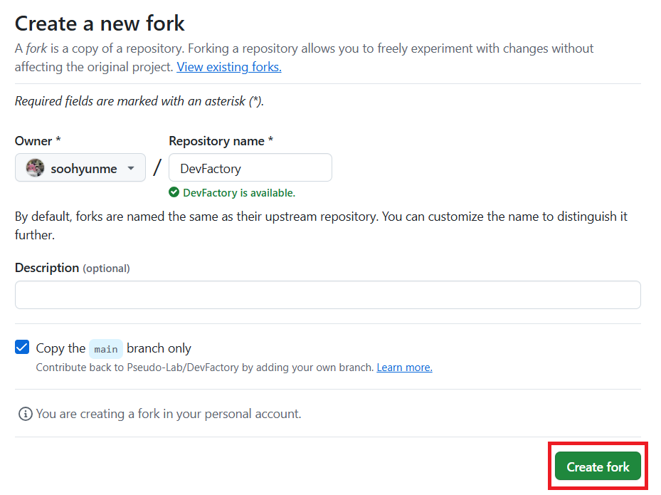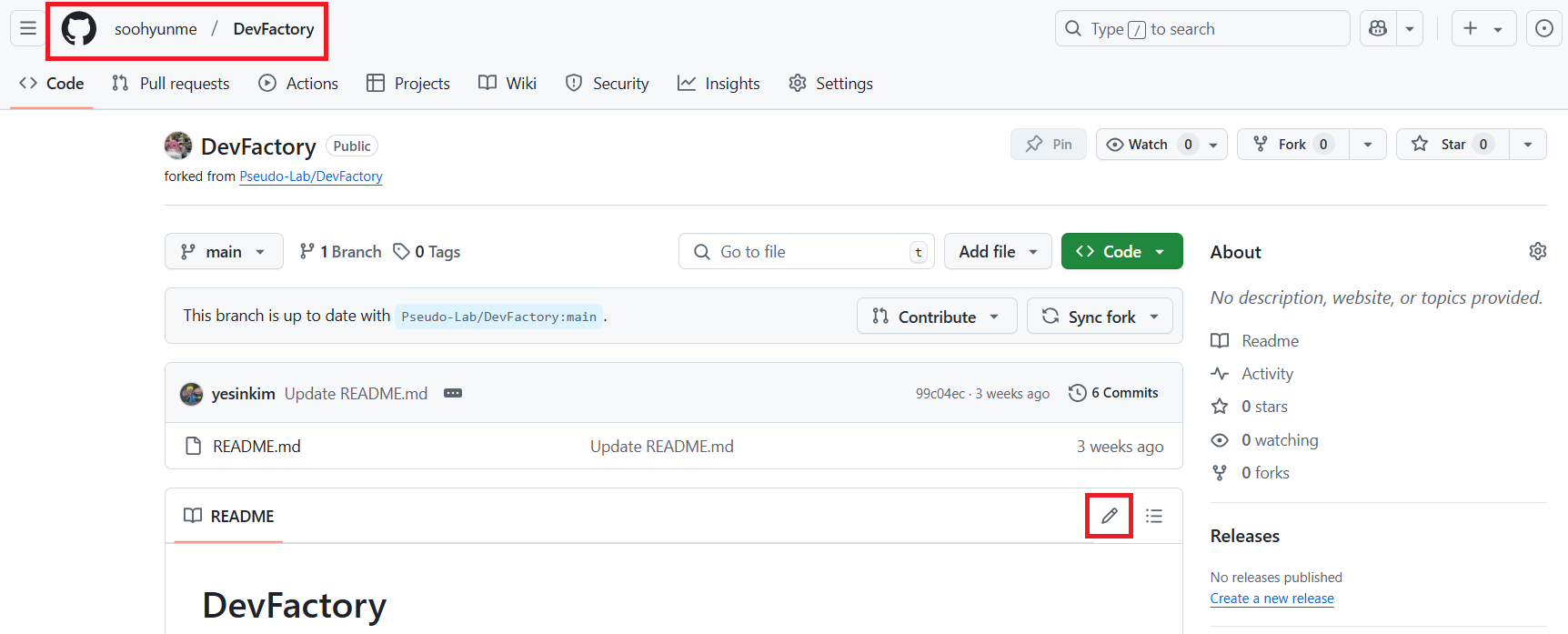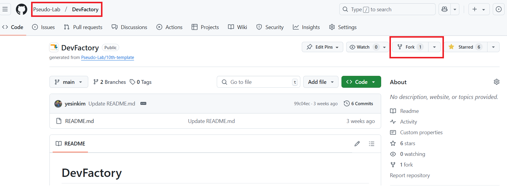본 가이드에서는 DevFactory 리포지토리를 예시로 사용합니다.본인이 속한 스터디 저장소에서 오른쪽 상단의 Fork 버튼을 클릭합니다.