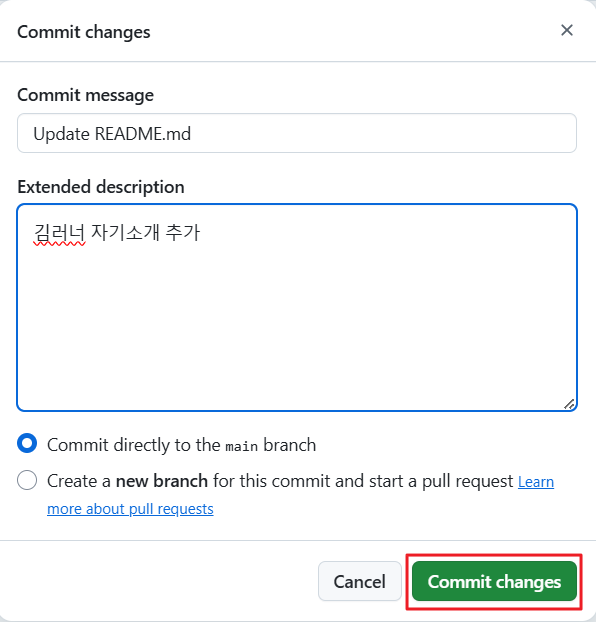 아래와 같이 commit 메시지와 설명을 작성하고, Commit changes 버튼을 클릭합니다.