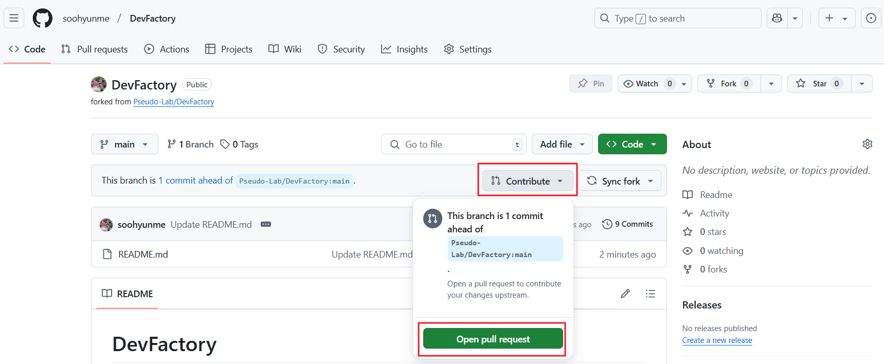 커밋 및 Push가 완료되면, Fork한 저장소에서 다음과 같이 내용이 업데이트 됩니다.