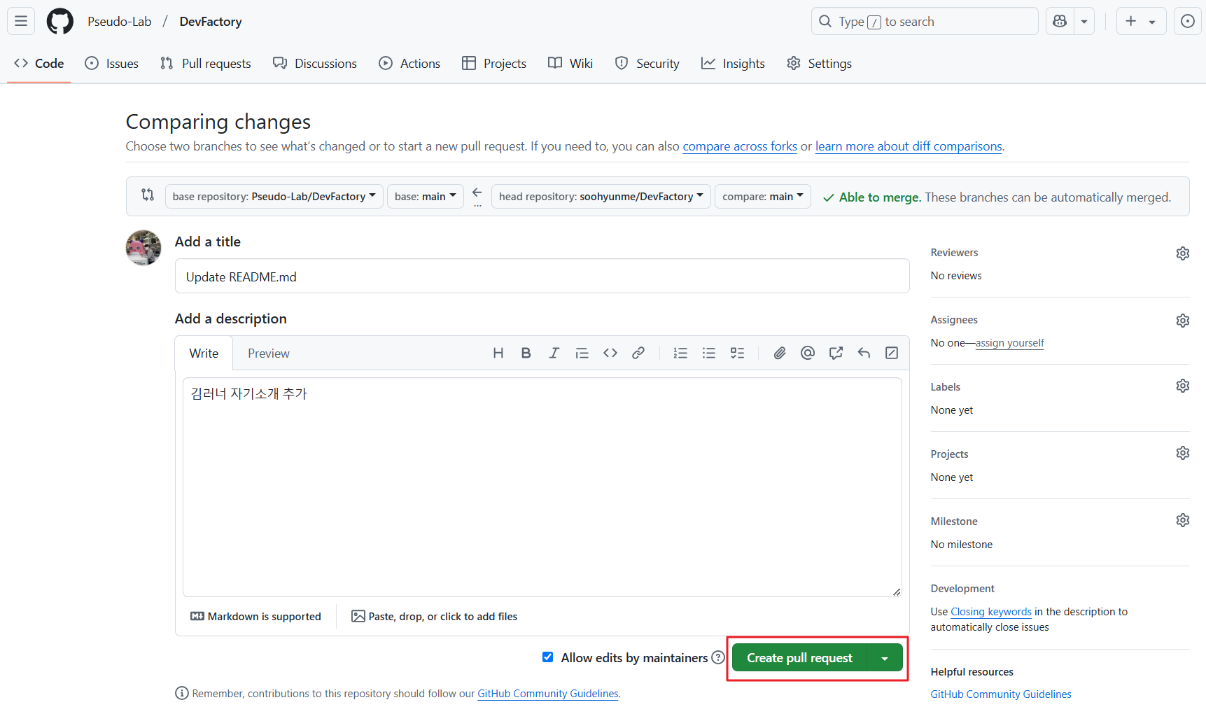 변경사항에 대한 내용을 간략히 작성한 뒤 Create pull request 버튼을 클릭합니다.