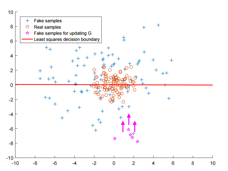 (원래 Discriminator 는 이보다 더 고차원이지만) 간략히 2차원을 표방하면 결정경계를 위와 같이 나타낼 수 있습니다. 윗 쪽이 가짜 영역, 아래 쪽이 진짜 영역입니다 이 때, 아래에 보면 진짜 데이터 샘플과 거리가 먼 가짜 데이터 샘플이 존재합니다. 즉, NLL Loss 를 사용한다면, Generator 의 입장에서는 이미 Discriminator 를 잘 속이고 있기 때문에 학습할 필요가 없게 됩니다. 즉, Vanishing Gradient 현상이 일어나기 때문에, Discriminator 를 잘 속인다는 이유만으로, 안 좋은 샘플을 생성하는 것에 대해 패널티를 줄 수가 없게 됩니다. 이 때, LSGAN 을 사용한다면 실제 데이터 분포와 가짜 데이터 샘플이 거리가 먼 것에 대해서도 패널티를 주게 됩니다.
