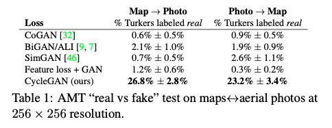 Table 1 은 AMT perceptual realism task 에 대한 성능을 나타냅니다. CycleGAN 의 지도에서 항공 사진, 그리고 항공 사진에서 지도 translation 결과에서 약 1/4의 참가자를 속일 수 있었던 반면에 그 외 모든 baseline 모델은 참가자를 거의 속일 수 없었습니다.