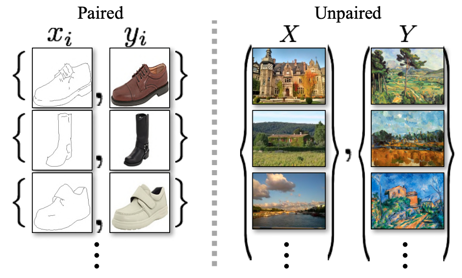 Image-to-image translation 은 input image 를 다른 스타일, 속성, 구조 등을 가진 output image 로 변환하는 task 입니다. 예를 들어 사진을 그림으로 변환한다거나, 낮에 찍은 사진을 밤에 찍은 것 처럼 변환하는 것을 말합니다. 흔히 translation 은 input 과 output 로 짝이 지어진 데이터를 바탕으로 학습이 이루어져 있었는데요. 짝이 지어진 사진 데이터를 얻는 것은 어렵고 값이 비싼 일이 됩니다.