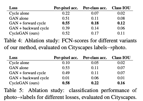 GAN 과 cycle consistency loss 의 중요성을 보여주는 ablation study 입니다. GAN loss 그리고 cycle consistency loss 를 각각 제거하면 성능이 크게 저하되는 부분을 확인할 수 있습니다. 또한 한쪽 방향에 대해서만 GAN + forward cycle 만 돌렸을 때와 GAN + backward cycle 만 돌렸을 때 학습의 불안정성을 보이고, mode collapse 를 유발하는 것을 확인할 수 있었다고 합니다.