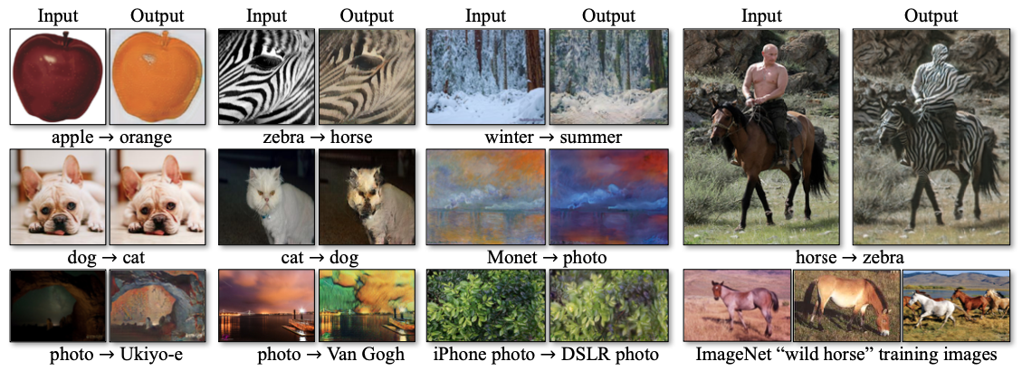 결과적으로 collection style transfer, object transfiguration, season transfer, photo enhancement 등의 task 에서 이미지 pair 가 존재하지 않는 상태에서 우수한 결과를 보여줬다고 합니다.