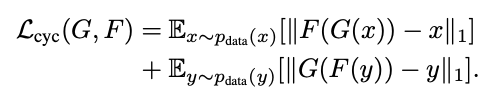 cycle consistency loss: 학습된 mapping \(G\) 와 \(F\) 가 서로 모순되는 것을 방지하기 위한 것.