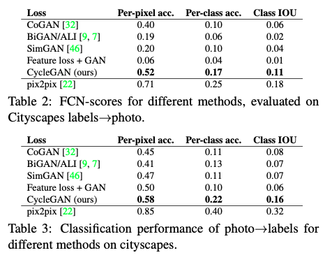 Table 2, Table 3 는 각각 도시 풍경에 대한 label -> photo, 그리고 photo -> label translation task 의 성능을 보여줍니다. 두 경우 모두 CycleGAN 이 baseline 들의 성능을 능가합니다.